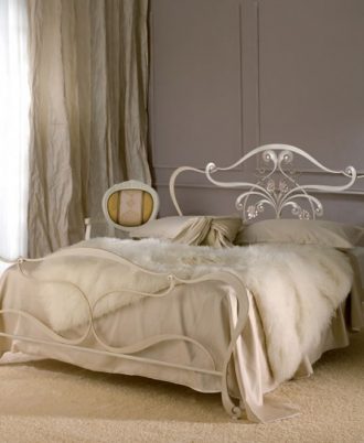 Letto con elementi in ferro pieno forgiato e fusioni floreali cesellate qui presentato nella finitura decorato perlato rosa di Cipro.