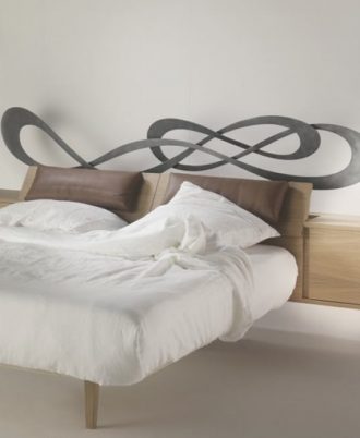 Letto con struttura in legno impiallacciato in massello di Rovere naturale, con cassetti laterali. Scultura reversibile in ferro pieno forgiato. Base Alveo in legno multistrato di betulla.